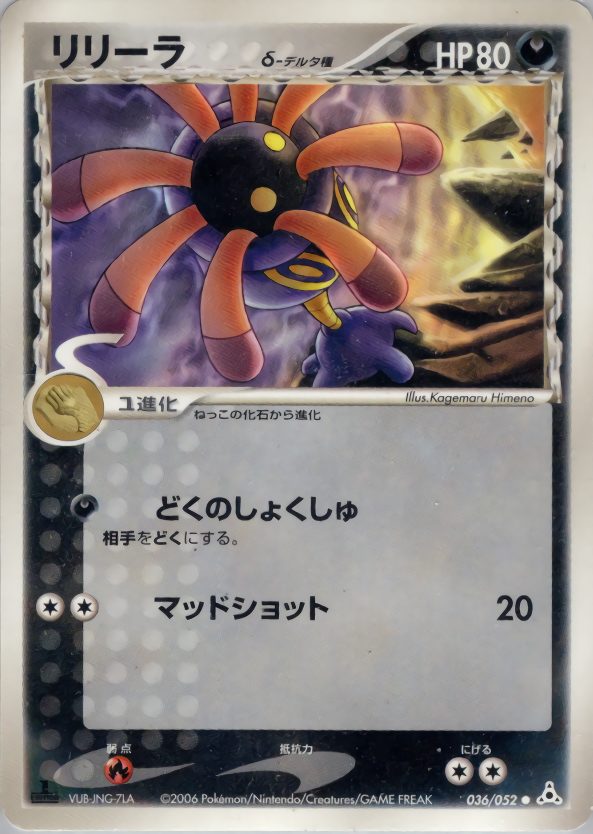 約 1億年前に 絶滅した ポケモン。海底の 岩に くっつき 花びらの ような 触手で 寄ってきた 獲物を 捕まえる。